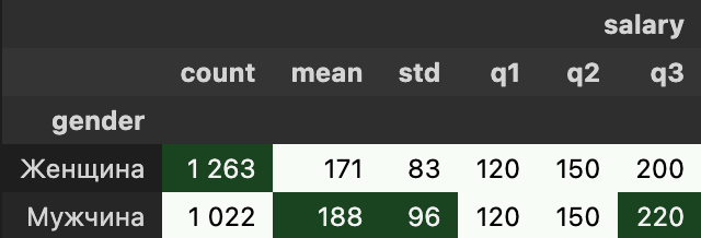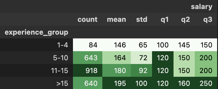experience_group — это группы по опыту работы, count — количество резюме, mean — среднее значение зарплаты, std — стандартное отклонение, q1-q3 — квантили.
