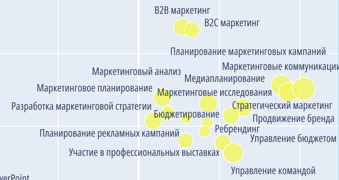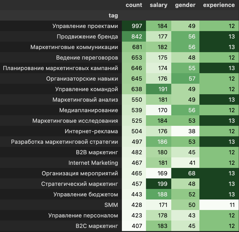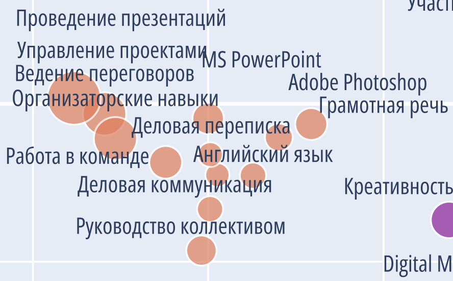 С другой стороны, женщины выделяются в таких областях, как PR, копирайтинг, знание английского языка, продвижение бренда, организация мероприятий и бюджетирование.