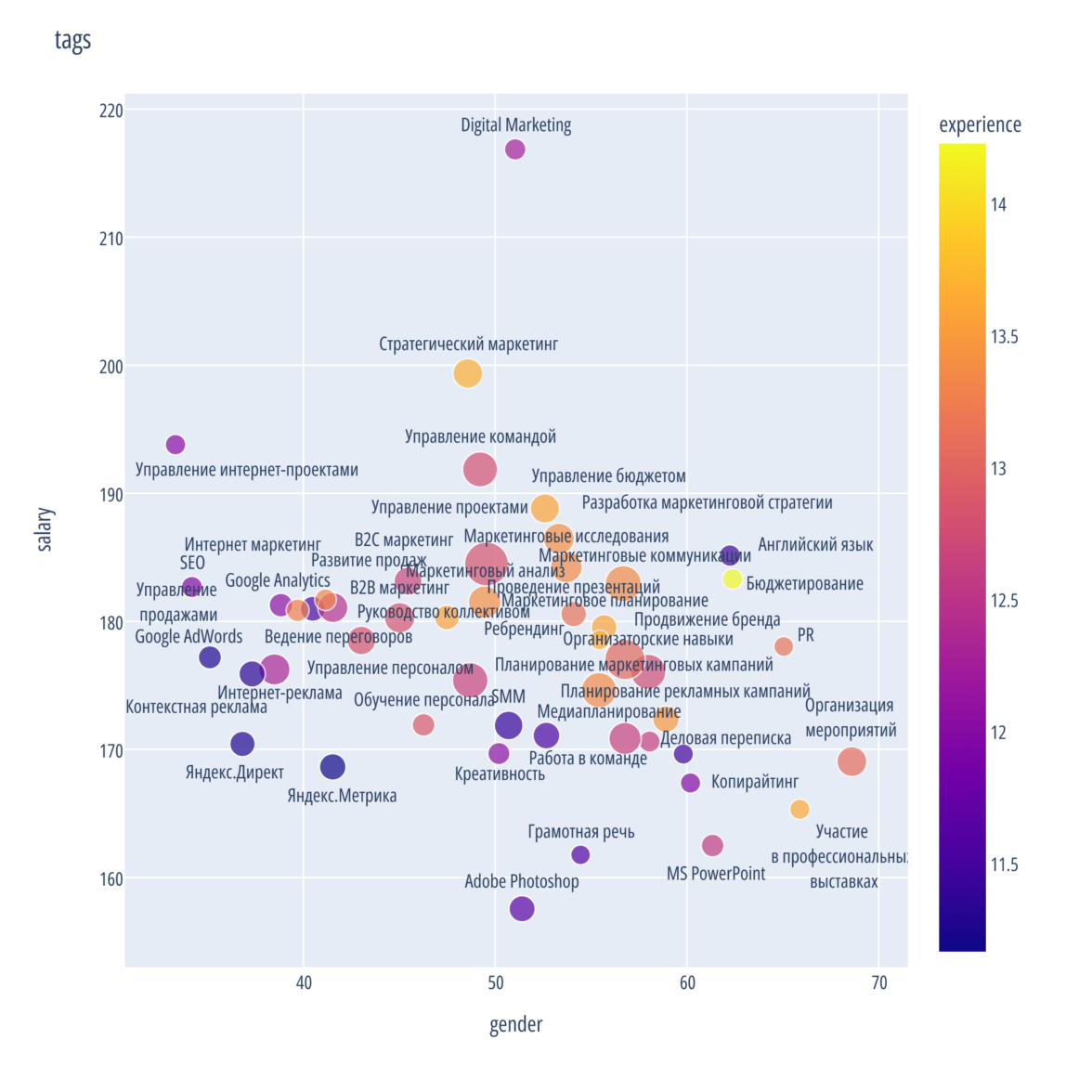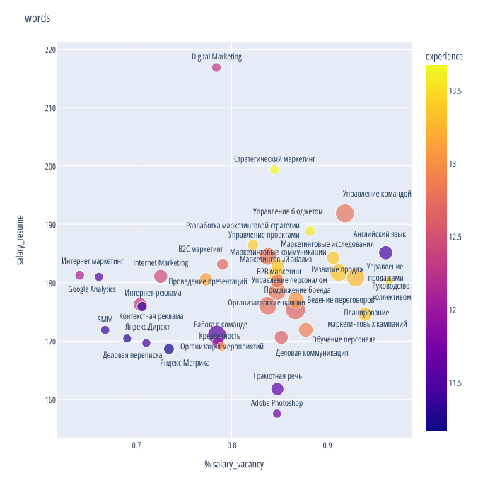 По вертикали — зарплатные ожидания у директоров по маркетингу, по горизонтали — отклонение от вакансий, размер точки — количество упоминаний в резюме, цвет — опыт.
