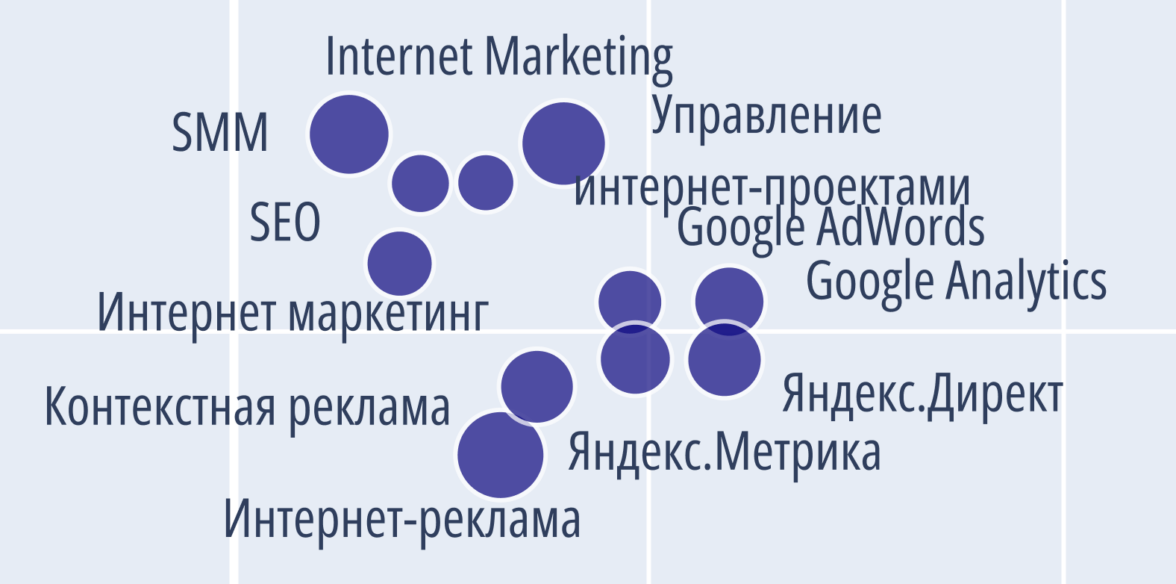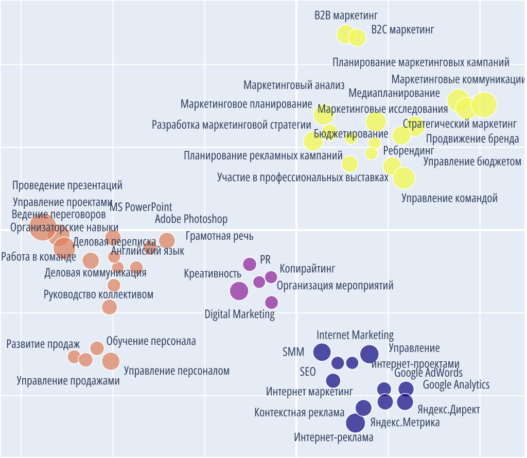 Этот алгоритм позволяет находить кластеры в данных. Значения осей абстрактны, облака точек указывают на близкие группировки. В данном случае они показывают совместное упоминание скиллов в резюме.