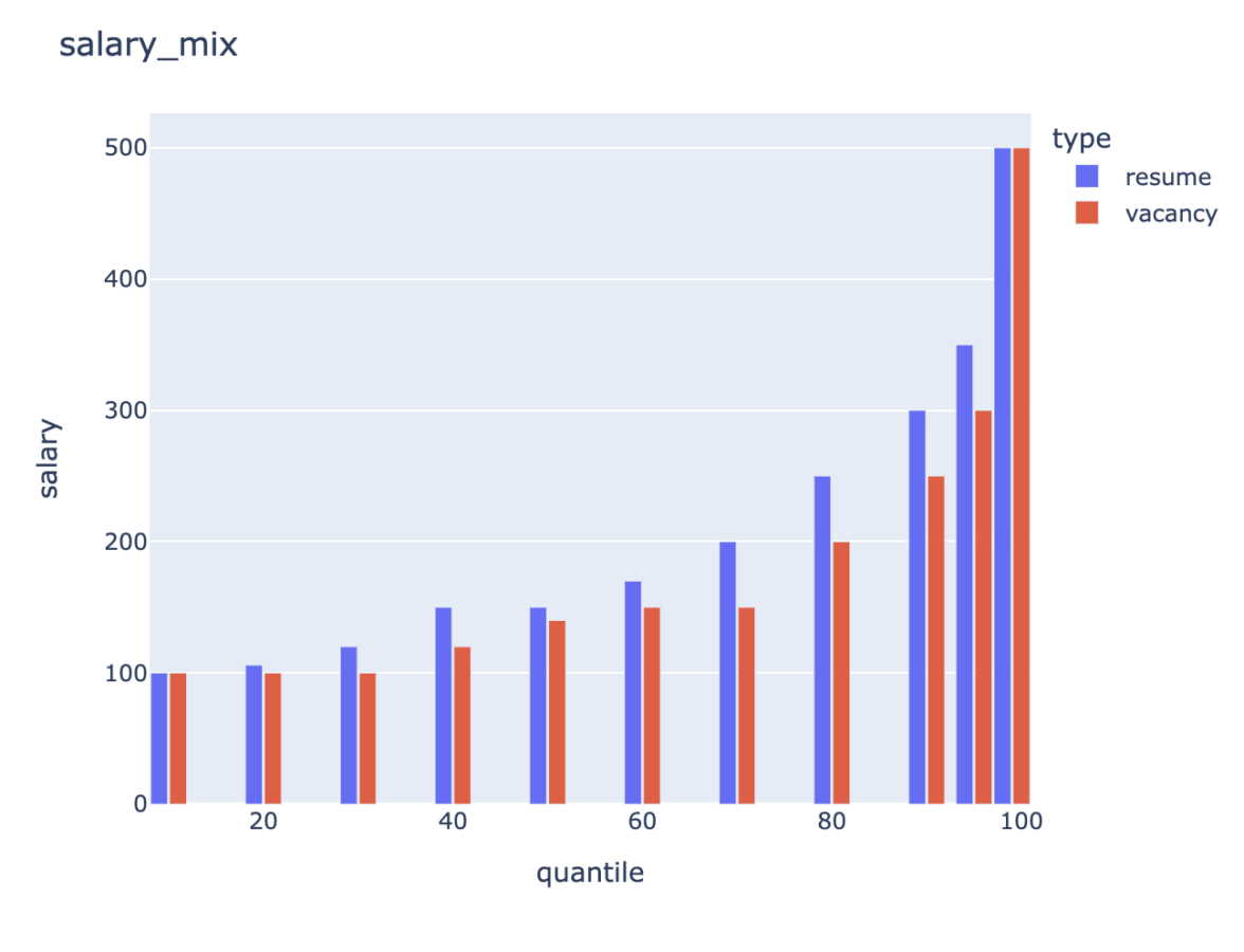 Если провести классификацию вакансий и резюме по процентилям по уровню заработной платы, мы получим следующую визуализацию на графике.