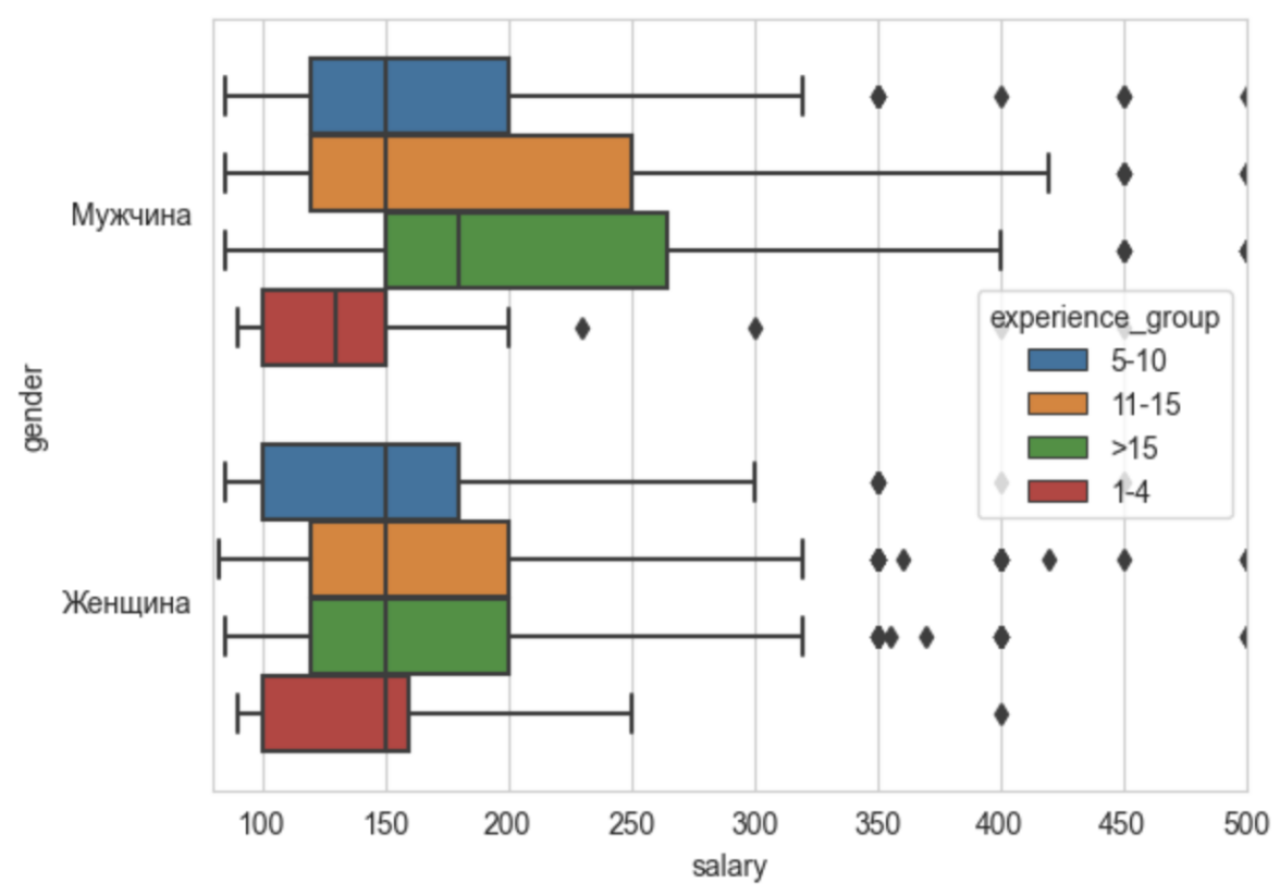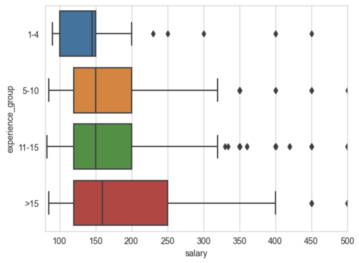 Видно, что разбросы в зарплатных ожиданиях достигают наивысших значений в самой опытной группе. Это свидетельствует о том, что наличие большого опыта не всегда гарантирует успех, ибо разброс значений оказывается очень значительным.