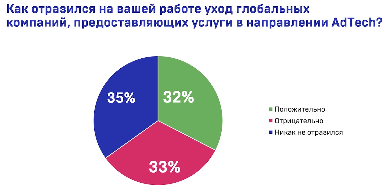 Деятельность 35% участников исследования не изменилась с потерей иностранных adtech-решений, а еще для трети опрошенных уход западных поставщиков рекламных технологий имел положительный эффект.
