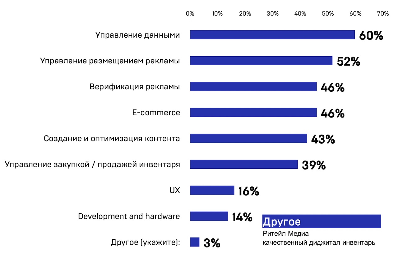 Самым актуальным технологическим направлением для рекламного рынка в ближайшие два года респонденты считают управление данными, этот вариант отметили 60% опрошенных. 52% участников исследования назвали востребованным управление размещением рекламы, 46% указали на актуальность верификации рекламы и развития технологий e-commerce.