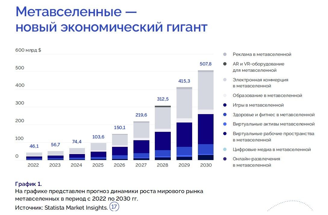 По данным Statista, в 2025 году объем рынка метавселенных достигнет 103,6 млрд долларов. Ожидается, что в период 2025–2030 гг. этот рынок будет демонстрировать среднегодовой темп роста в 37,43%, что приведет к увеличению его объёма до 507,8 млрд долларов США к 2030 году.