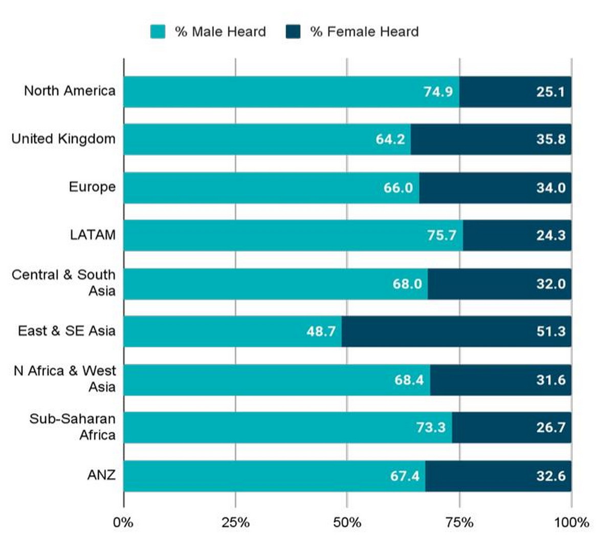 Восточная и Юго-Восточная Азия — единственные регионы, где соотношение мужчин и женщин, чьи образы или голоса используются в рекламе, практически соответствует соотношению мужского и женского населения.