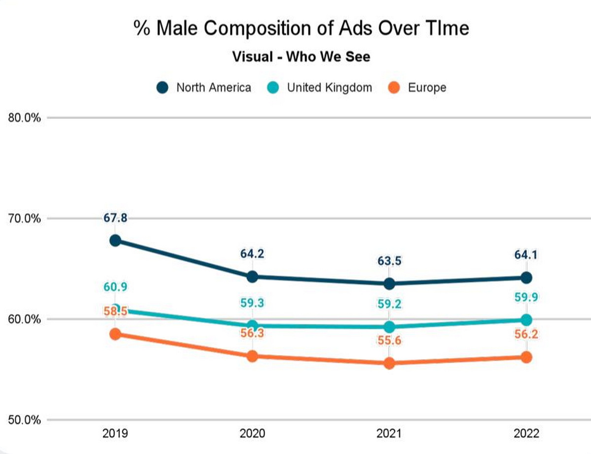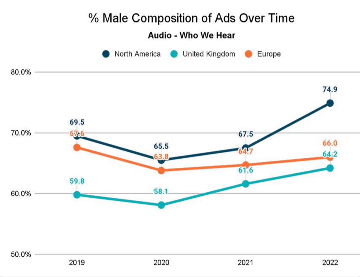 С 2019 года по 2022 год в Северной Америке и Великобритании количество образов мужчин в видеорекламе несколько сократилось. Однако результаты исследование показали значительный рост числа использования мужских голосов в аудиорекламе и озвучке рекламных роликов. Так, в Северной Америке в 2022 году 74,9% рекламных аудио- и видеороликов были озвучены мужчинами. В Европе и Великобритании этот показатель практически равен и колеблется от 64,2% до 66%.