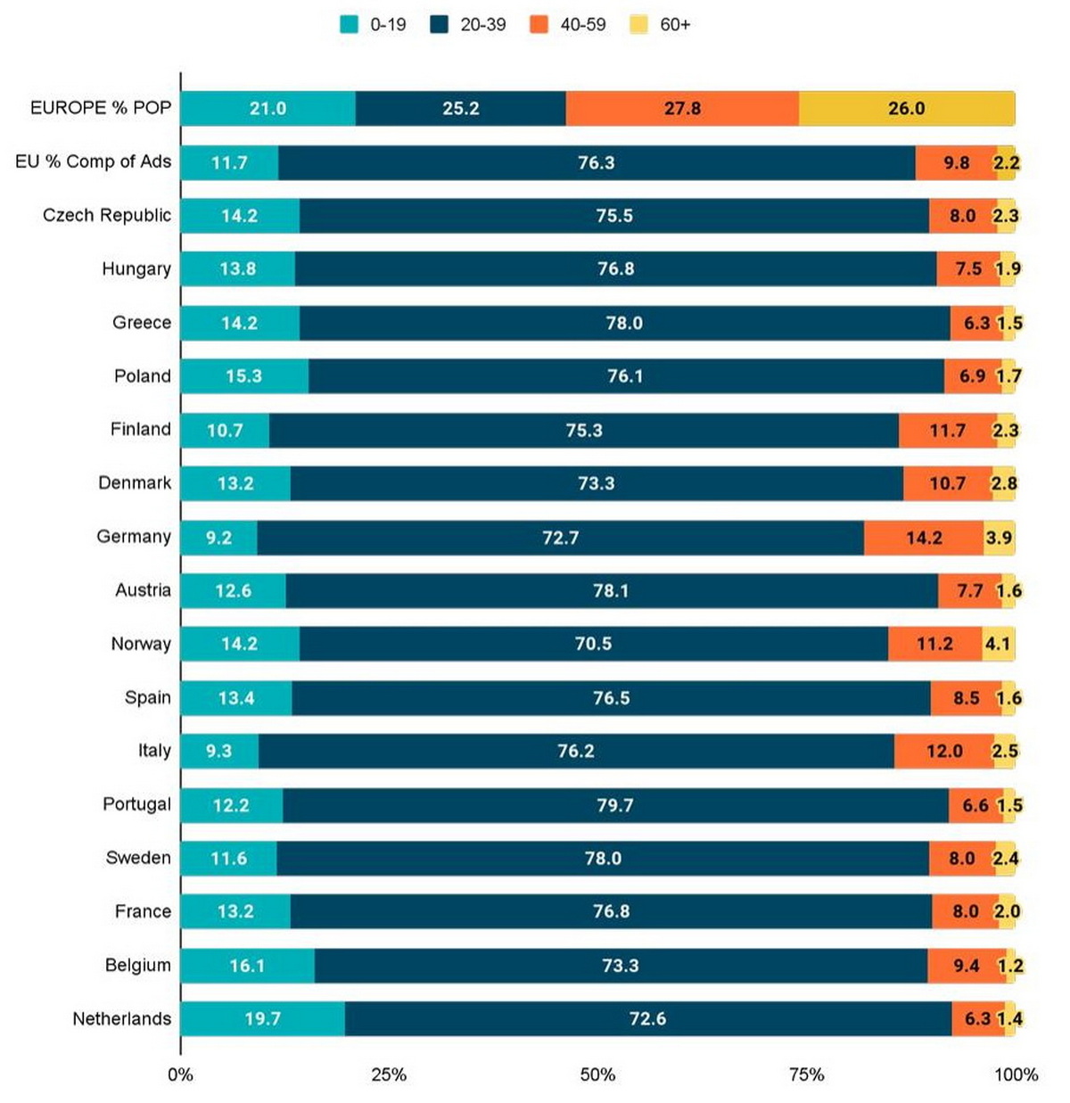 Несмотря на то что в Европе разные возрастные группы имеют сходную или близкой к этой величине численность, здесь можно наблюдать такую же картину: рекламные агентства предпочитают занимать в рекламе людей в возрасте от 20 до 39 лет.