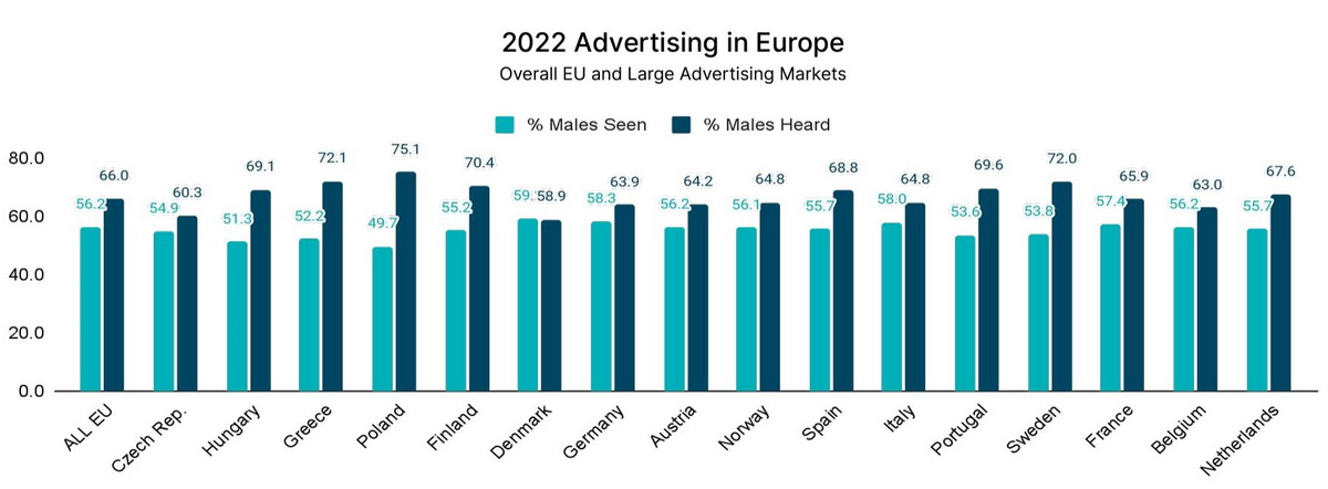В целом видеореклама в Европе демонстрирует более сбалансированный актерский состав мужчин и женщин, чем в Северной Америке и Великобритании. Но в озвучке рекламы и здесь в большей степени представлены мужчины. Из материалов исследования видно, что во всех из 16 проанализированных европейских стран рекламодатели в первую очередь предпочитают использовать мужские голоса. Исключение составляет Дания, где доли рекламного аудио- и видеоконтента с участием мужчин-актеров (около 59%) и женщин практически равны.