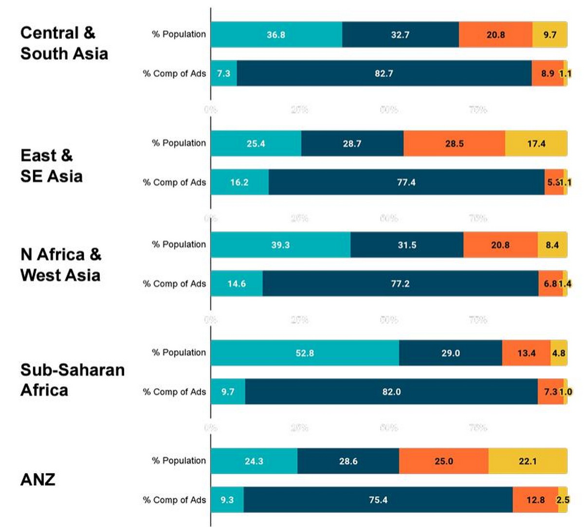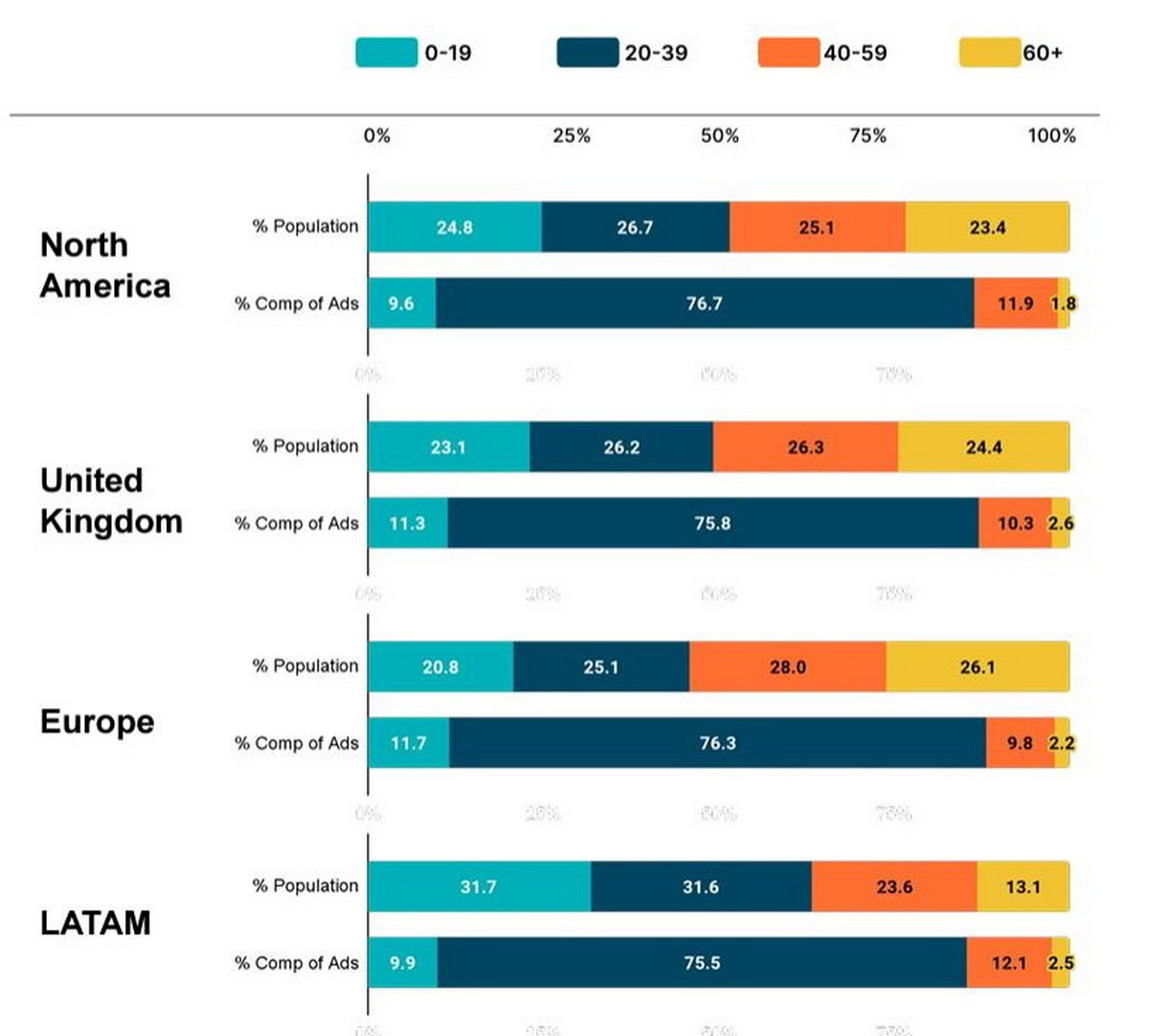 На графиках, представленных в исследовании, доминирует темно-синие полосы. Этим цветом аналитики проиллюстрировали людей в возрасте 20-39 лет. Актеры этой возрастной группы лидируют в глобальном рекламном креативе по всему миру независимо от возрастного состава населения региона.