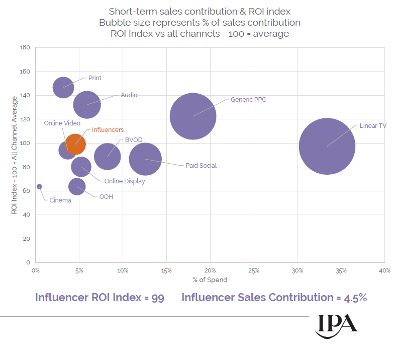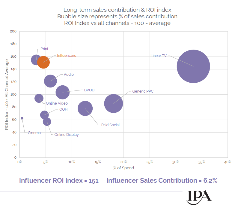 Рекламодатели традиционно считают инфлюенс-маркетинг performance-инструментом для краткосрочного увеличения продаж. Но это не так. По результатам исследования инфлюенс-маркетинг сопоставим с ТВ-рекламой по возврату инвестиций (ROI). В краткосрочной перспективе каждый вложенный фунт возвращается рекламодателям через 13 недель после начала кампании. Но через два года после начала взаимодействия с блогерами инфлюенс-маркетинг показывает самую большую рентабельность инвестиций среди всех медиаканалов.