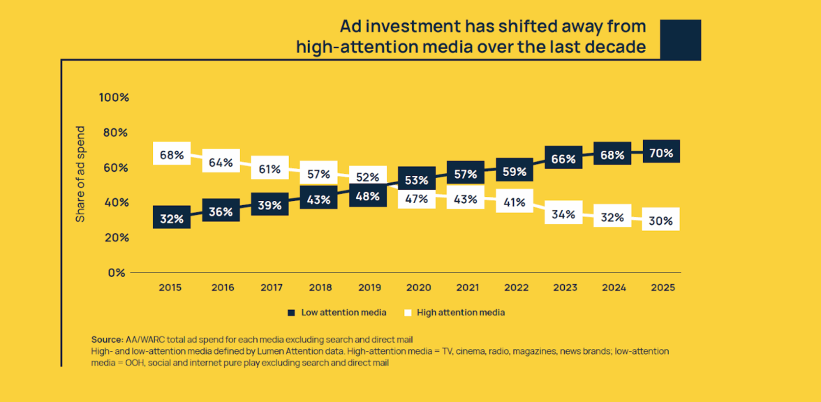 Проанализировав расходы рекламодателей на те или иные медиа за 10 лет с 2015 года, IPA и WPP пришли к выводу, что рекламные бюджеты перетекают из медиа с высоким вниманием в каналы с низким. Если в 2015 году на первые приходилось 68% всех бюджетов, то сейчас всего 30%. Напротив, медиа с низким уровнем внимания увеличили долю с 32% до 70%.