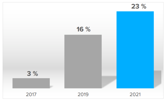 Процент аудиторных данных от общего маркетингового бюджета на онлайн-каналы. Источник: IAB Russia, 2017–2021 гг.