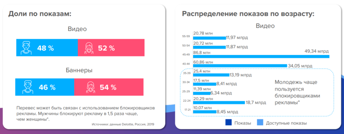 При этом доля показов рекламы среди женщин немного выше, чем среди мужчин. Одна из причин такой тенденции может быть в том, что мужчины блокируют рекламу в полтора раза чаще, чем женщины. А наибольшее количество показов приходится на более возрастную аудиторию — 40–50 лет. Скорее всего, это связано с тем, что молодежь всё меньше занимается серфингом в интернете и всё больше времени проводит в соцсетях — TikTok, Instagram и YouTube.