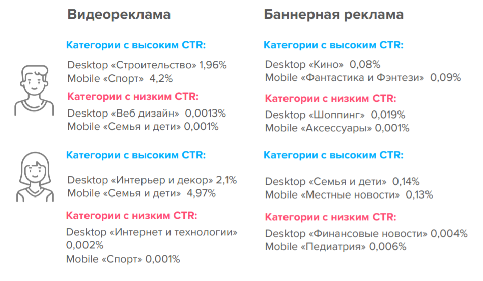 По данным исследования Getintent, пользователи реагируют на баннерную рекламу примерно одинаково, независимо от гендера. Это можно объяснить наличием общей «баннерной слепоты» у пользователей. А вот видеореклама — особенно показанная в контенте — более заметна. Женщины склонны кликать на нее чаще.