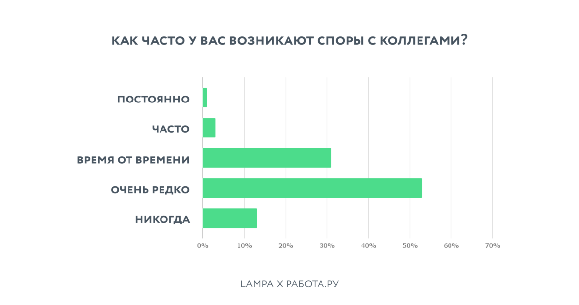 Исследование показало позитивные результаты: большинство россиян (53%) очень редко не сходятся во мнениях с коллегами по цеху, у 31% это случается лишь время от времени. Без оживленных дискуссий обходятся 13% опрошенных и всего 1% участников исследования поделились, что у них постоянно возникают споры с коллегами.