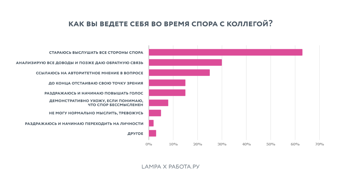 Как себя вести, если разногласия неизбежны? Согласно результатам опроса, 63% россиян во время спора с коллегами стараются выслушать обе стороны. 30% анализируют все доводы и только позже дают обратную связь, а 25% — ссылаются на авторитетное мнение в вопросе. 15% предпочитают до конца отстаивать свою точку зрения, столько же сотрудников раздражаются и повышают голос.