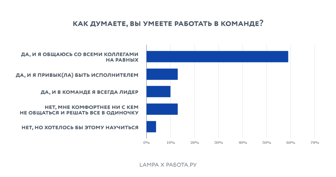 Согласно результатам опроса, 59% россиян умеют работать в команде и общаются со всеми коллегами на равных. Меньше сотрудников (13%) привыкли быть только исполнителями. Столько же респондентов (13%) рассказали, что им комфортнее ни с кем не общаться и решать все самостоятельно. А вот каждый десятый (10%) отметил, что в коллективе он всегда занимает позицию лидера. При этом, не умеют решать задачи в команде всего 4% опрошенных — однако очень хотели бы этому научиться.