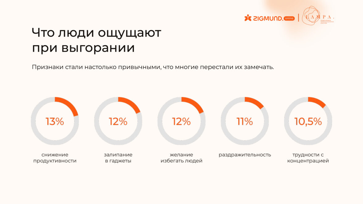 Международное коммуникационное агентство LAMPA и сервис для заботы о ментальном здоровье Zigmund.online провели исследование*, чтобы выяснить, как за три года изменилось моральное состояние представителей креативных индустрий — PR, маркетинга, SMM, дизайна, ивента, журналистики и других. Если в 2022 году большинство тревожилось из-за финансовой нестабильности, переработок и отсутствия карьерного роста, то к 2025-му на первый план вышли признаки выгорания: хроническая утомляемость, трудности с концентрацией и постоянная потребность в вдохновении. При этом тревожность постепенно снижается: 46% считают себя подвластными этому состоянию, однако треть специалистов отмечают снижение по сравнению с 2022 годом.