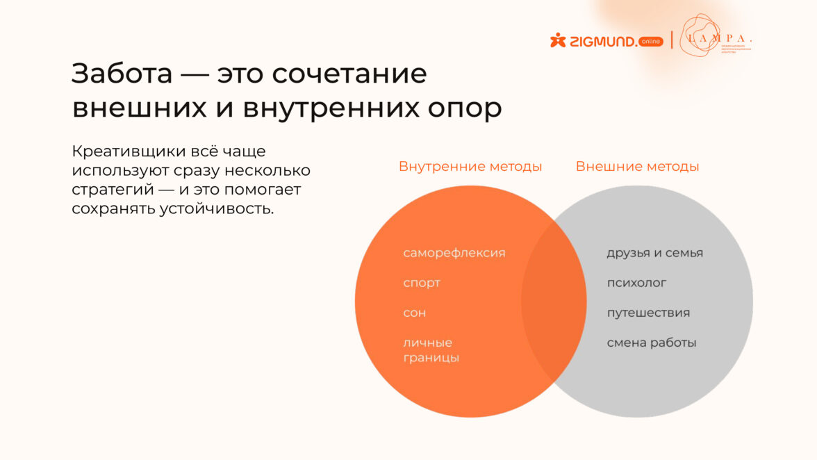 Чтобы сохранять баланс, креативщики научились выстраивать личные границы: 17% ограничивают новости, 15% работают строго по будням, 14% уделяют время спорту и себе, 13% следят за качеством сна, а 11% регулярно посещают психолога или психотерапевта.