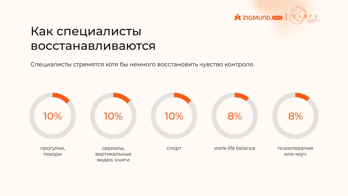 Способы справляться с этим тоже стали привычными: прогулки и пешие походы (10%), уход в сериалы, вертикальные видео и книги (10%), спорт (8%), соблюдение work-life balance (8%), психотерапия или работа с коучем (8%) и даже снятие напряжения алкоголем или курением (7%).