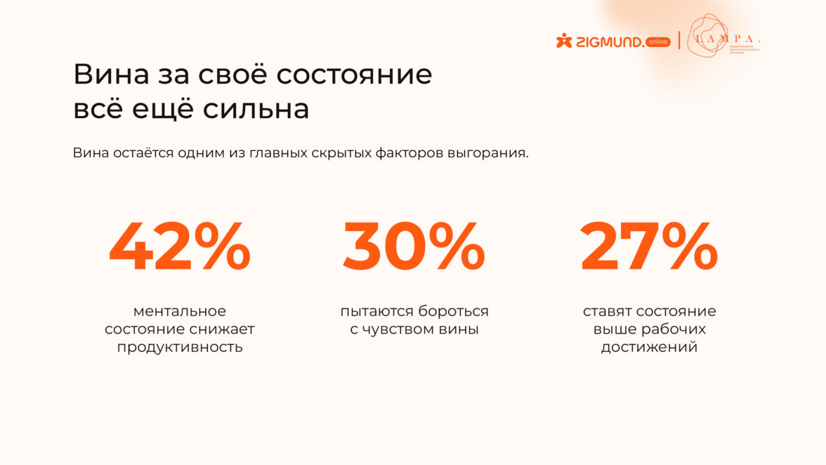 Чувство вины за то, что ментальное состояние мешает работе, сохраняется: 42% признаются, что это влияет на продуктивность, 30% стараются бороться с чувством вины, а 27% ставят своё состояние выше рабочих достижений.