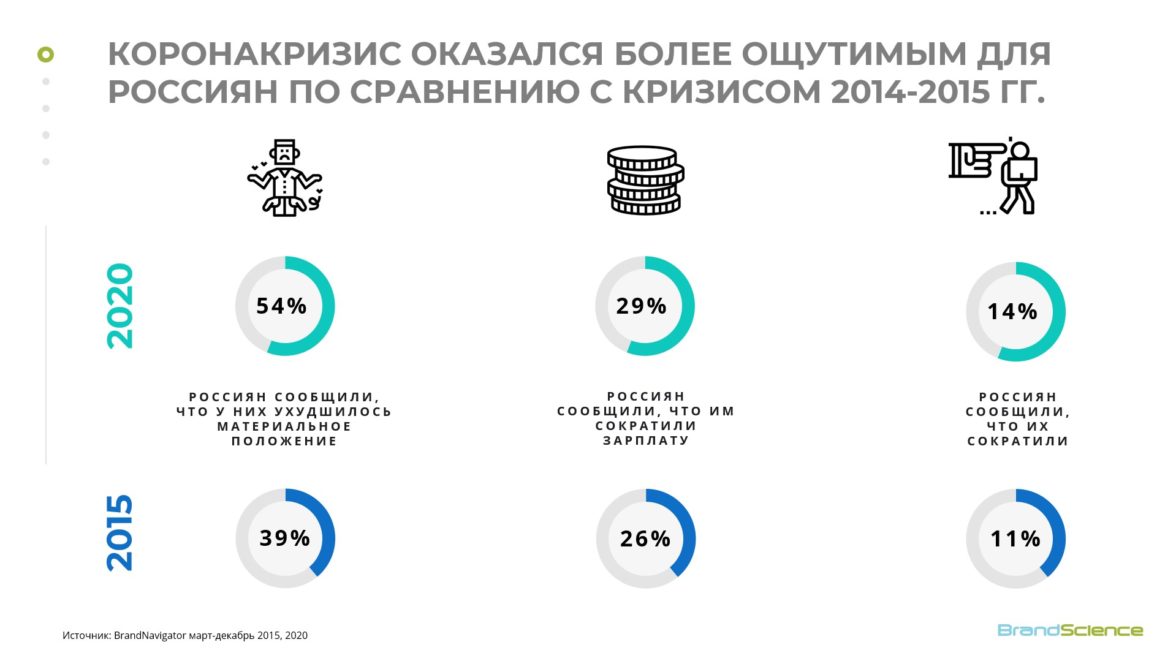 Коронакризис 2020-2021 годов — глобальный и пришел «извне». Современное общество и государственные институты столкнулись с пандемией впервые, государство пыталось балансировать между решениями в пользу здоровья граждан и поддержки бизнеса, в частности, снижения ключевой ставки, однако меры, связанные с локдауном, все равно стали шоковыми. Кроме того, на фоне пандемии существенно снизились цены на нефть, что также нанесло ущерб российской экономике. Экономические последствия пандемии россияне ощутили в большей степени, чем последствия кризиса 2015 года. Это подтверждают данные, полученные BrandScience с помощью собственного инструмента Brand Navigator. По итогам 2020 года 54% россиян сообщили, что у них ухудшилось материальное положение, тогда как в 2015 году на это жаловались 39%. В 2015 году 26% россиян сообщили, что им уменьшили зарплату, а в 2020 — 29%. О сокращении на работе сообщили 14% в 2020 против 11% в 2015 году.