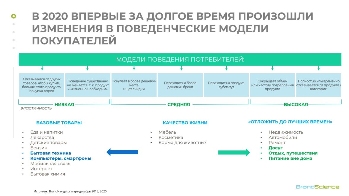 • До лучших времен на неопределённый срок теперь откладывается то, что раньше было предметом накоплений или долгосрочной покупки. К таким категориям относятся недвижимость, автомобили и товары для ремонта. Люди или полностью отказываются или значительно сокращают объем или частоту потребления продуктов этих категорий.