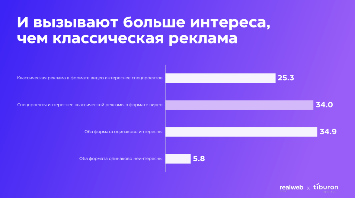 При этом 34% отметили, что формат спецпроектов их привлекает больше, чем формат классической рекламы через видео, за этот вариант проголосовало 25%.