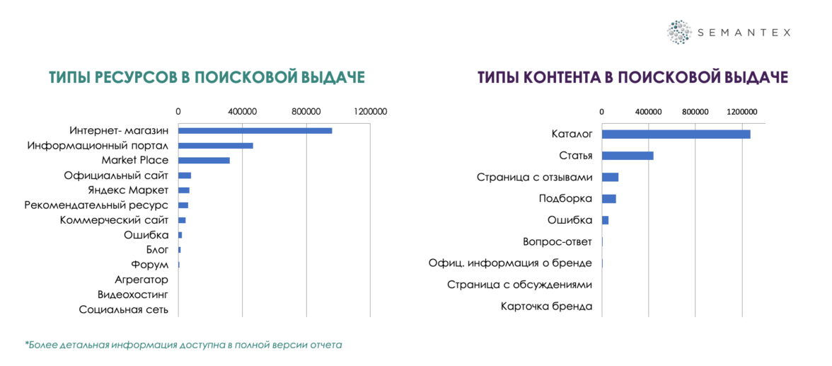 Отметим, что в выдаче пользователи в основном видят интернет-магазины, информационные порталы и маркетплейсы. Самый популярный (с т.з. приходящего трафика) тип контента — каталог, статья, страница с отзывами.