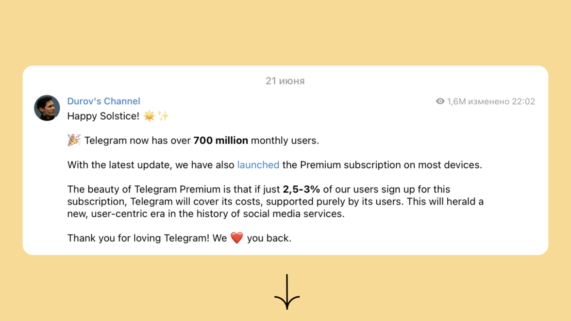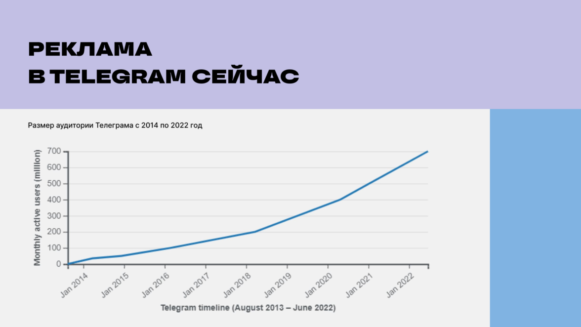 Мы наблюдаем, как Telegram продолжает стремительно набирать популярность. В июне 2022 года Павел Дуров поделился новостью о том, что мессенджер установили 700 миллионов пользователей. Сотовые операторы фиксируют, что объём трафика в Telegram значительно превышает аналогичные показатели своих конкурентов.