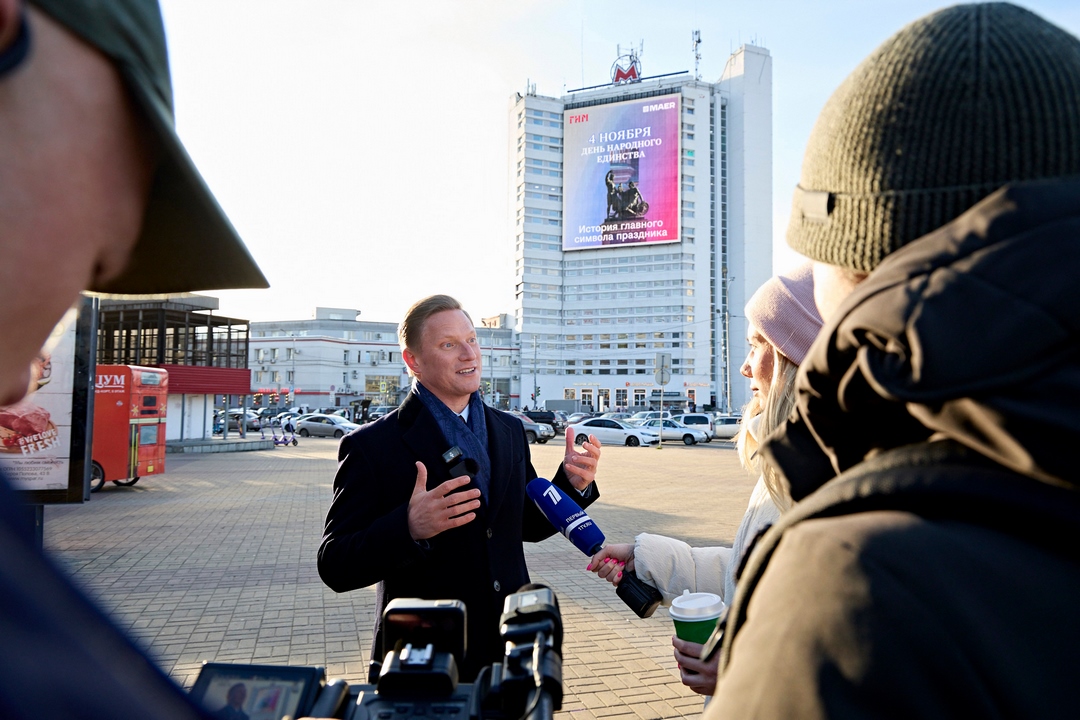С 30 октября по 4 ноября на больших уличных экранах запущено сразу несколько информационных кампаний. Жителей российских городов поздравляют с праздником Администрация Президента, об истории главного символа Дня народного единства — памятнике Минину и Пожарскому — медиахолдинг МАЕР рассказывает совместно с Государственным историческим музеем, о важной дате напоминает Российское военно-историческое общество, а телекомпания «Известия» проводят параллели между прошлым, настоящим и будущим России.