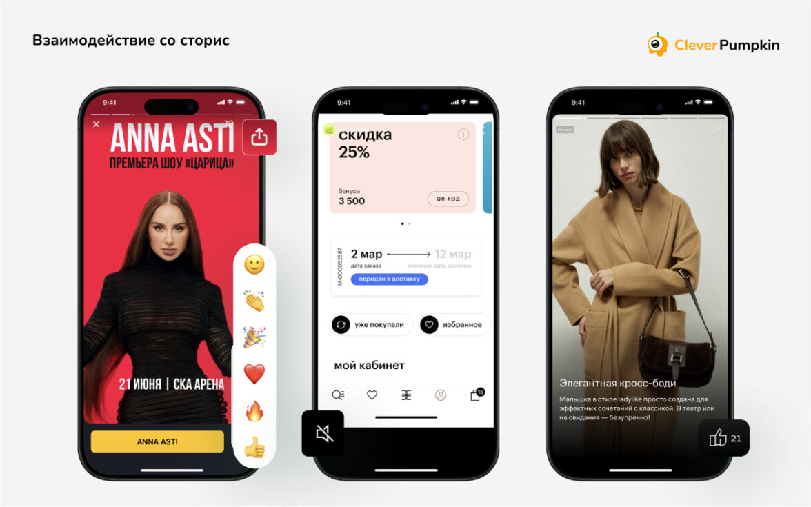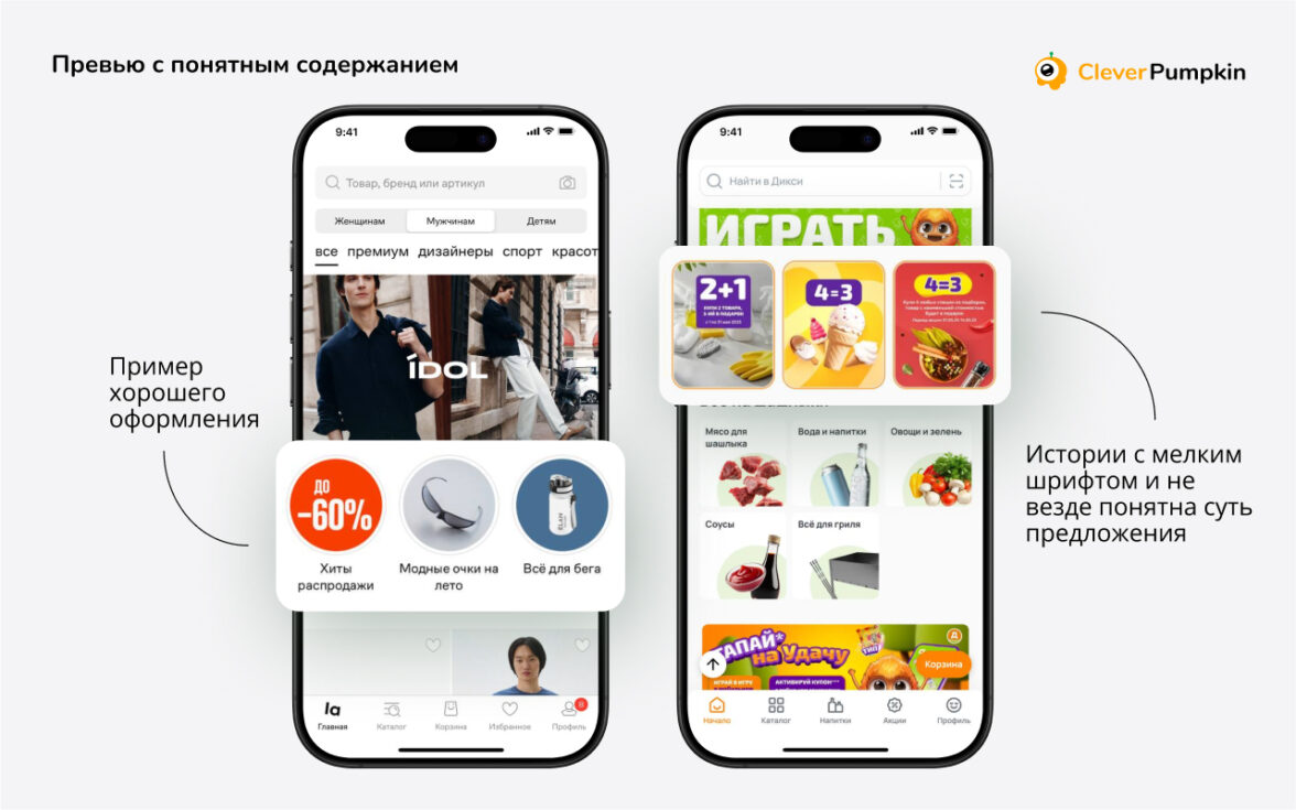 К тому же благодаря привычному формату акции воспринимаются не как реклама, а как выгодное предложение. Stories говорят с пользователем на одном языке — они нативно встроены, и поэтому работают лучше, чем баннеры и пуши.
