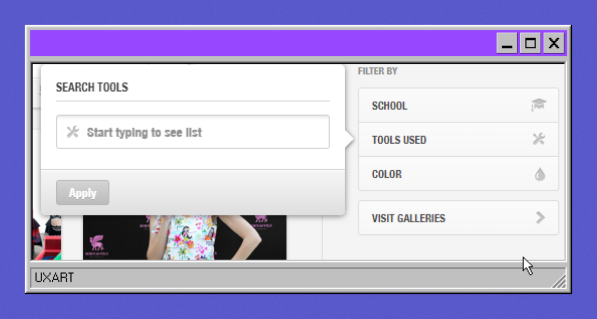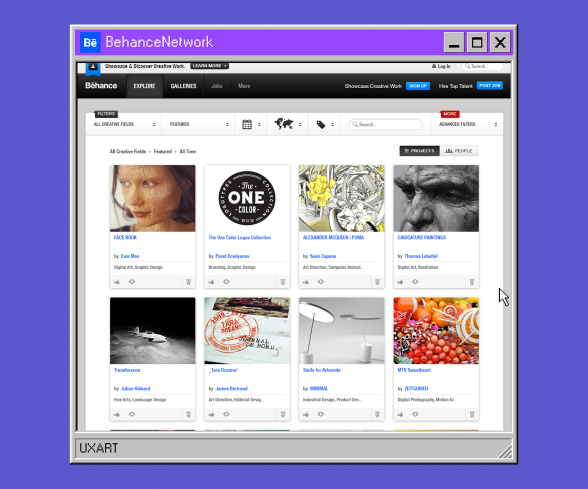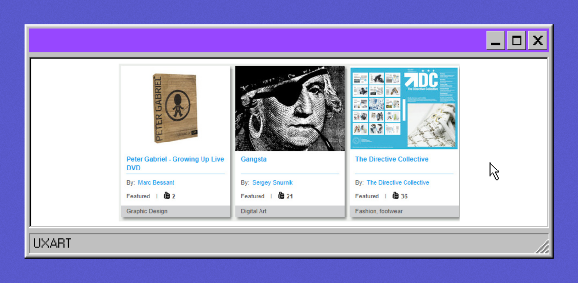 Проблема с фильтрацией здесь — отсутствие акцента. Да, с одной стороны она выделяется ярким синим цветом, но на фоне всего многообразия на экране она просто теряется. Работы дизайнеров были представлены в виде карточек, которые включали: