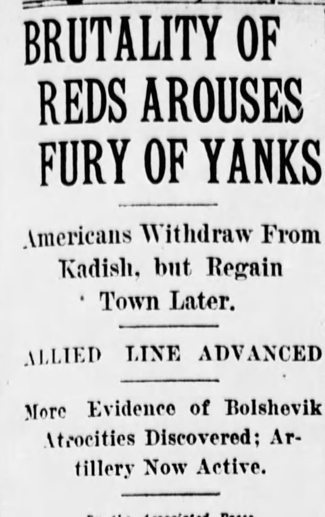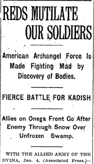 Корреспондент агентства Associated Press 4 января 1919 года передал из России материал под названием «Жестокость красных приводит янки в ярость». В нем приводились данные из рапорта некоего подполковника Коберли. 29 ноября 1918 года в районе Шенкурска 62 американца неожиданно столкнулись с отрядом примерно из 700 большевиков. Семь американцев были убиты, еще семеро пропали без вести. Трупы убитых были обезображены. «№1 — лейтенант, голова размозжена топором. №2 — капрал, голова разбита топором так, что сохранилась только часть лица. №3 — капрал, голова размозжена топором, руки и ноги перебиты, вероятно, ударами обуха. №4 — рядовой, голова размозжена топором. №5 — рядовой, голова размозжена, горло перерезано, вероятно, лезвием топора».