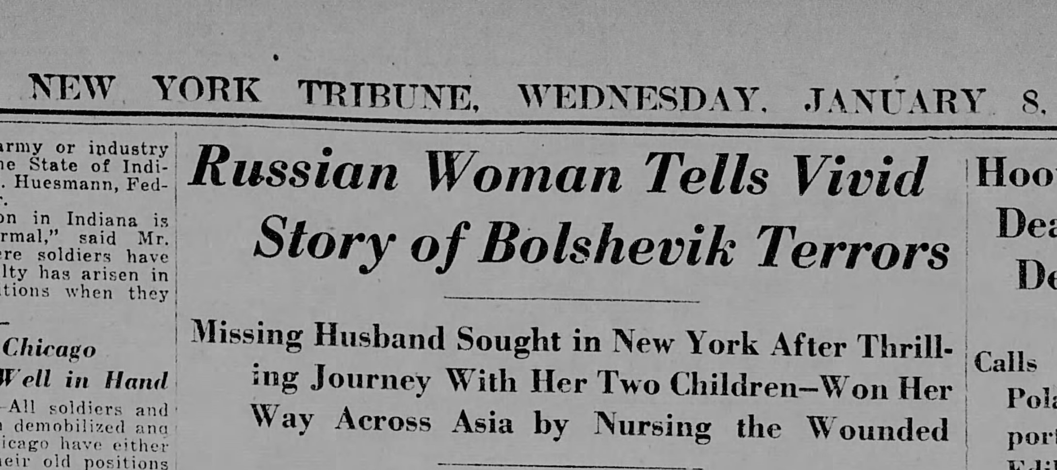 Газета New York Tribune 8 января 1919 года опубликовала «красочный рассказ русской женщины о большевистском терроре». Юная миссис Самуэль Шмуль Штайнберг с двумя детьми проехала полмира в поисках мужа. Ее муж был журналистом, драматургом, одним из директоров Московско-Петроградского банка. Сама она училась на медицинском факультете Московского университета. В декабре 1917 года банк, в котором работал муж, был национализирован. Он нашел место в нью-йорском National City Bank и отправился в Америку. Жизнь в Москве стала кошмарной. Фунт хлеба стоит 25 рублей ($12,50 в деньгах того времени, когда покупательная способность доллара была в 22 раза выше современной), пара туфель — 200-300 рублей. Когда бедная женщина послала кухарку за мукой, на обратной дороге два большевика приставили той стволы оружия к голове и отобрали мешок муки. У самой женщины большевики однажды спросили документы, а когда она открыла кошелек — забрали все деньги. Некоторое время спустя большевики пришли к ней домой — и поселились в ее доме. Ей еле удалось упросить непрошеных гостей оставить ей с двумя детьми хотя бы одну комнату. Но, поскольку «соседи» каждую ночь напивались, она решила покинуть Москву. Устроившись в санитарный поезд, она добралась до Казани. Вскоре этот город был взят чехословаками. Попав на территорию белых, женщина с детьми сумела через Дальний Восток, Японию и все США добраться до Нью-Йорка — в надежде найти мужа.
