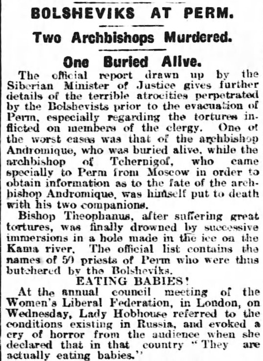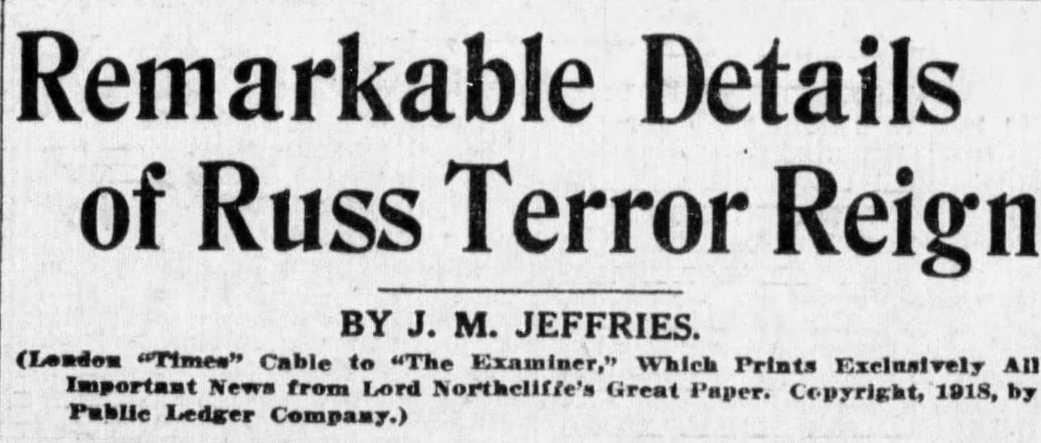 «Война народов» закончилась 11 ноября 1918 года, а уже в январе 1919 года американские газеты пестрели рассказами об ужасах в большевистской России. Так, 2 января 1919 года газета The San Francisco Examiner перепечатала материал варшавского корреспондента лондонской The Times о красном терроре. Вот о чем узнал американский читатель газет вслед за английским: