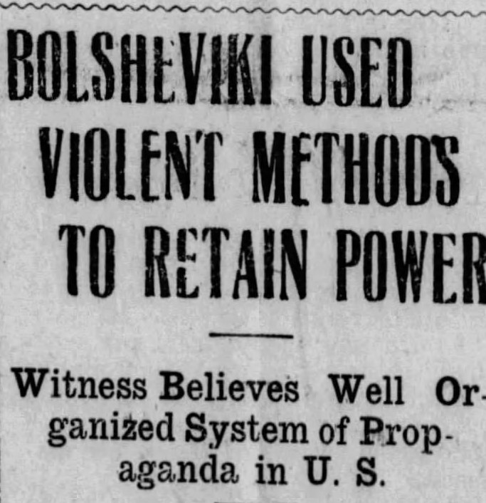 Газеты рассказывали, что 11 февраля бывший торговый атташе посольства США в Петрограде Уильям Чепин Хантингтон давал показания комиссии сената по вопросам пропаганды. Он заявил, что у большевиков есть две претензии к американскому государству: во-первых, им не нравится, что США вступили в войну, во-вторых, не нравится, что США — не социалистическое государство». А потому большевики могут уничтожить американское государство — как любое другое, которое они не одобряют.