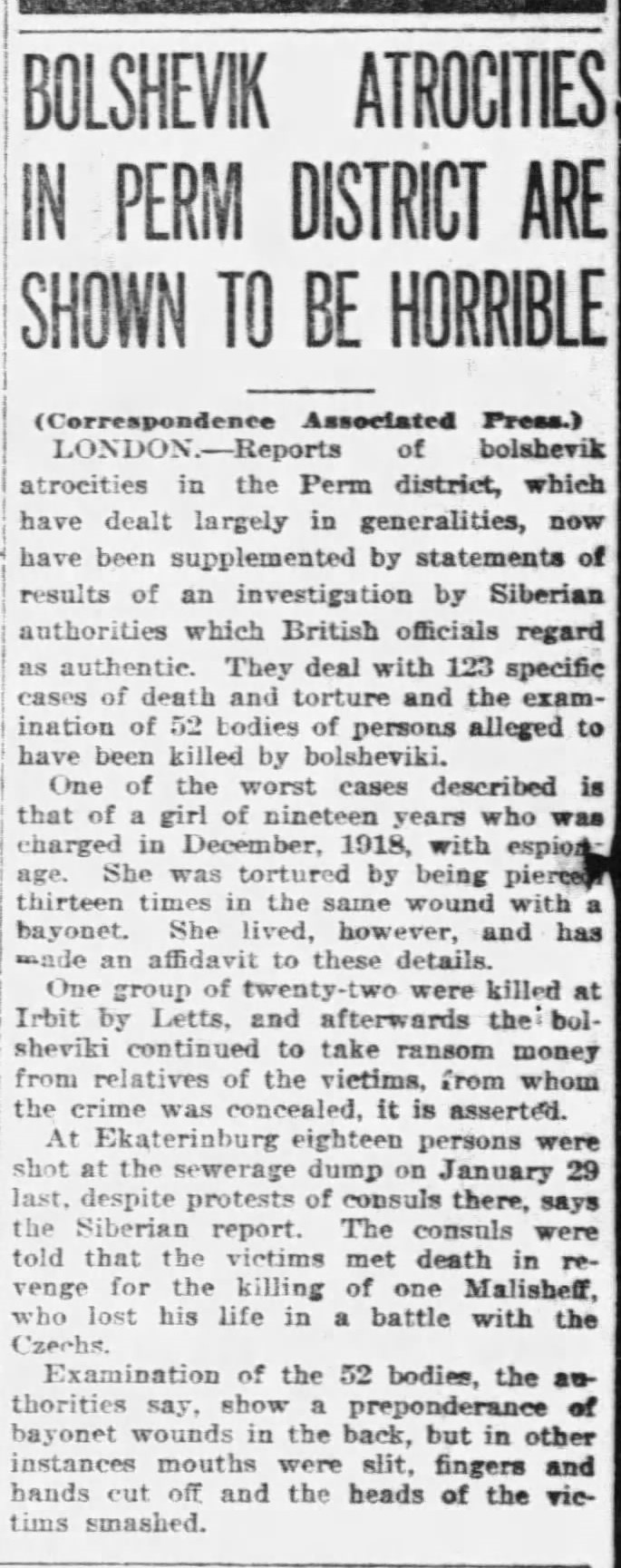 В начале мая агентство Associated Press сообщало, что после освобождения Перми от красных специальная комиссия провела расследование 123 случаев смерти и пыток, в которых подозревали большевиков, было проведено вскрытие 52 трупов. Особенно жестоким мучениям подвергались священнослужители. Архиепископа Андроника похоронили живьем. Архиепископа Черниговского, специально приехавшего в Пермь из Москвы, чтобы узнать судьбу Андроника, тоже убили, как и двух его спутников. Епископа Феофана после жестоких пыток утопили в полынье в Каме. Список убитых священнослужителей состоит из 50 имен. 19-летнюю девушку, обвиненную в декабре 1918 года в шпионаже, пытали, 13 раз воткнув штык в одну рану. Она выжила и дала показания следственной комиссии. 22 человека были расстреляны латышами в Ирбите, после чего большевики продолжали вымогать деньги у родственников убитых, скрыв факт расстрела.
