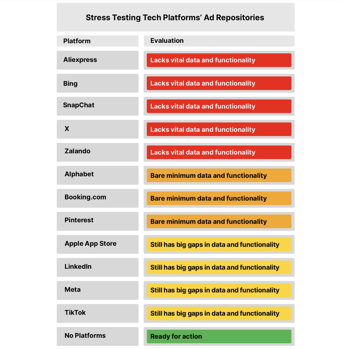«Стресс-тест» устроили 11 интернет-платформам — AliExpress, App Store, Bing, Booking.com, Google, YouTube, LinkedIn, Meta, Pinterest, Snapchat, TikTok, X, и Zalando — по более чем 20 параметрам, включая функциональность, доступность данных и корректность работы. Такие параметры заданы в требованиях DSA и, как не преминули отметить авторы, в правилах собственной библиотеки рекламы Mozilla.
