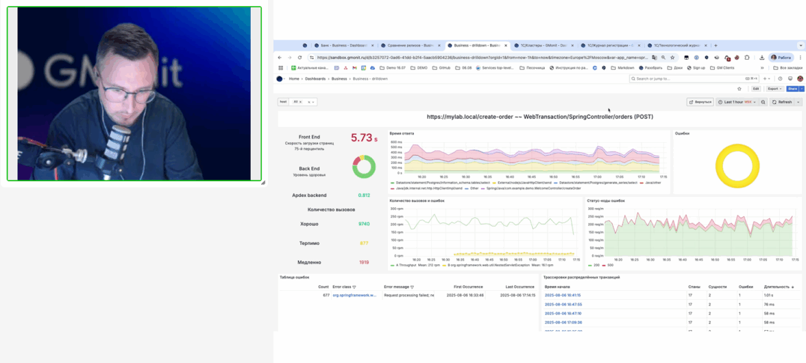 Инженер предпродажной подготовки Денис Василенков разобрал кейс обнаружения инцидентов с помощью GMonit. Демо началось с дашборда здоровья бизнеса — экрана, который помогает понять, где компания теряет прибыль. Зрители увидели, что шаг «Оформление заказа» находится в красной зоне: Backend тормозит, API вызывает ошибки. Один клик — и участники оказались в транзакции POST/create-order, где стало заметно: Frontend ждет 5.1 секунды, Backend выдает NestedServletException, а проблема находится во внешнем API вызове. В результате платформа позволила быстро «провалиться» внутрь транзакций (без grep и ручного поиска) и понять, из каких компонентов складывается время ответа, на каком шаге произошел сбой и какие атрибуты были у запроса.