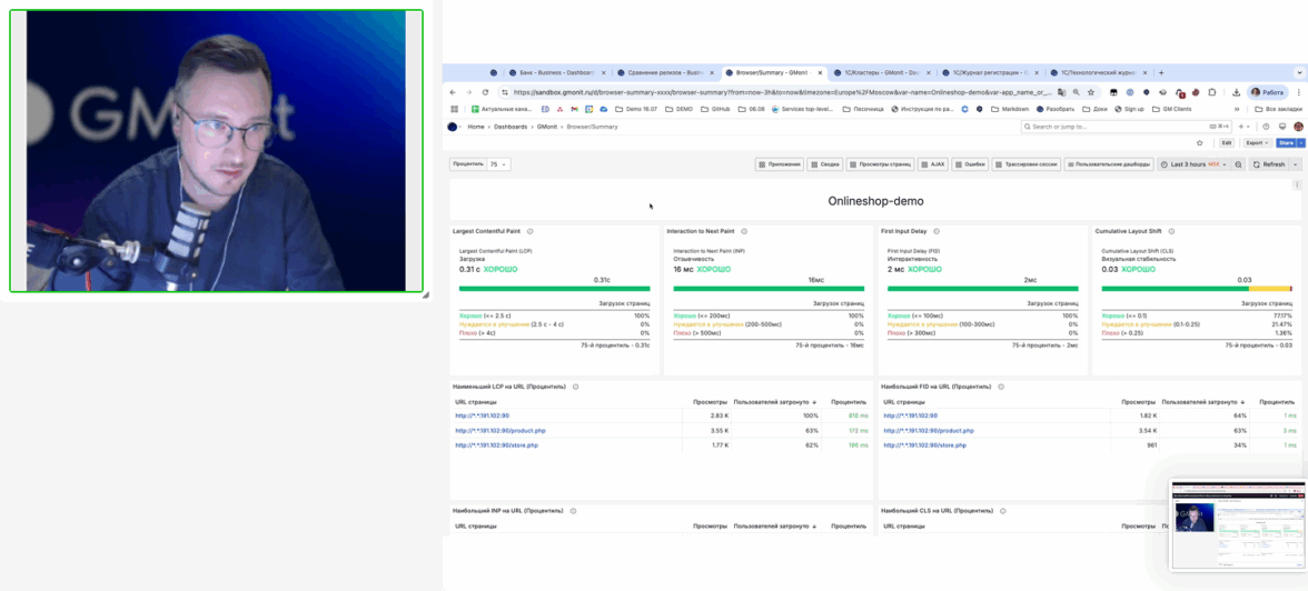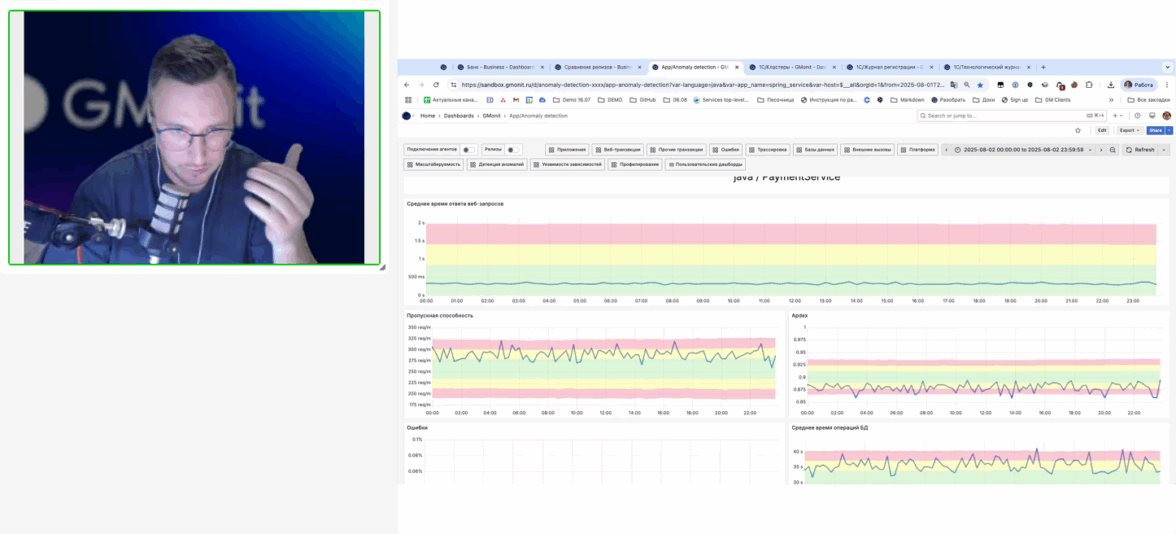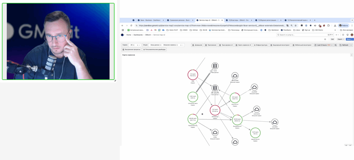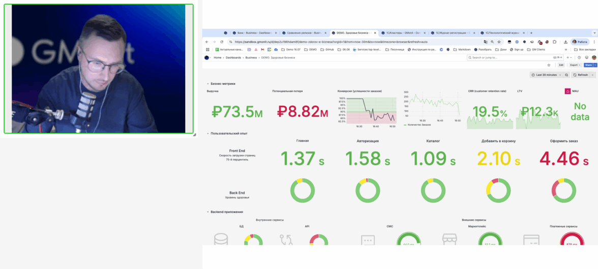 Также специалист продемонстрировал ключевой функционал GMonit, который помогает понимать и предупреждать проблемы, влияющие на бизнес: