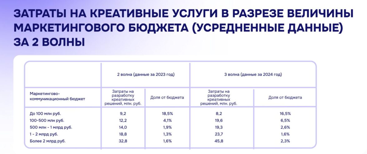 Крупные и средние рекламодатели увеличили бюджеты на разработку креатива, по результатам исследования Creative Health Tracking АКАР и АЦ РИР. Больше всего — на 61% — выросли расходы рекламодателей с годовыми бюджетами от 100 до 500 млн рублей. Единственной группой, сократившей креативные бюджеты, стали рекламодатели с расходами на маркетинг ниже 100 млн рублей в год — у них средние затраты упали на 11% год к году. Доля компаний, проводивших платные тендеры, увеличилась за год с 51% до 55%.