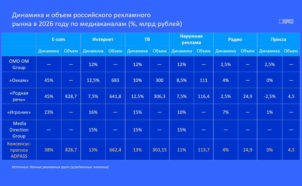 Пять групп, оценивающих объемы рынка по медиаканалам — OMD OM Group, «Оккам», «Родная речь», «Игроник» и Media Direction Group — тоже поставили ритейл-медиа на первое место с ростом 38% в 2026 году. Объем ритейл-медиа в абсолютных значениях оценила только «Родная речь» — в 828,7 млрд рублей, это выше, чем все другие медиаканалы.