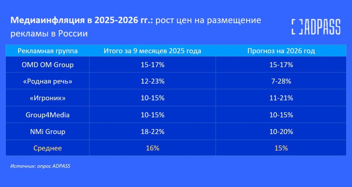 По оценке пяти рекламных групп из первой десятки — OMD OM Group, Group4Media, «Родная речь», NMi Group и «Игроник» — в 2026 году медиаинфляция достигнет 15%. Цены на размещение будут расти быстрее объемов рынка, которое группы оценивают в 12% в следующем году.