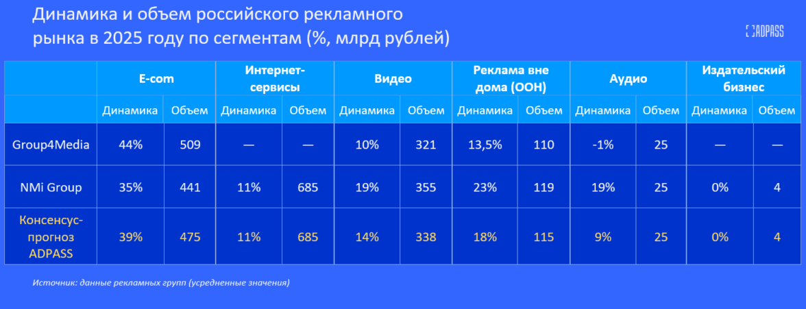 Свои прогнозы ADPASS предоставили восемь крупнейших российских рекламных групп из первой десятки — OMD OM Group, «Оккам», АДВ, SkyAlliance, Group4Media, «Родная речь», «Игроник», и NMi Group. На их основе ADPASS посчитал усредненные показатели по динамике объема рекламного рынка в 2025 году. Подробная методология указана в этом материале.