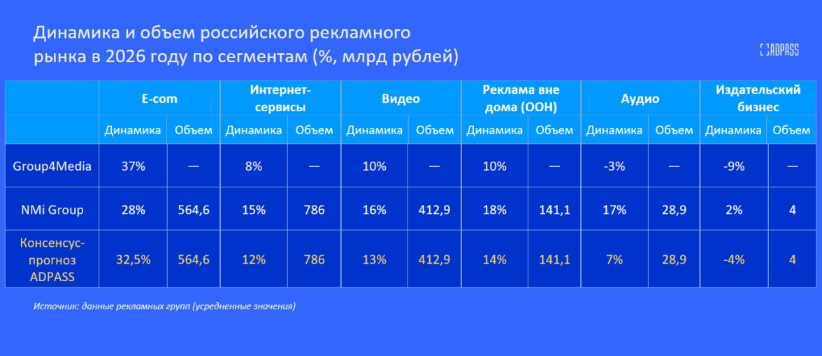 По прогнозу Group4Media и NMi Group, самым динамичными сегментами по оценке в 2026 году будут реклама вне дома, видео и интернет-сервисы с динамикой от 12% до 14% к 2025 году. Аудиореклама вырастет на 7%, расходы на рекламу в сегменте издательского бизнеса сократятся на 4%. Group4Media и NMi Group также дали прогноз в отношении рекламы в ритейл-медиа, которую эксперты АКАР не учитывают. В этом сегменте две группы ждут роста на 32,5%.