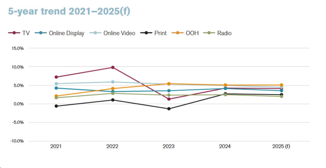 Динамика роста цен на мировую рекламу снизится почти во всех медиаканалах, за исключением рекламы вне дома (OOH), прогнозируют аналитики шведского медиааудитора ECI Media Management. Медиаинфляция в этом сегменте останется на уровне 2024 года — 5%.