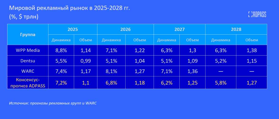 По обновленному консенсус-прогнозу ADPASS на основе оценок WPP Media, Dentsu и WARC, в 2026 году глобальная рекламная индустрия прибавит 6,8%. В 2027 году темпы роста вновь снизятся до 6,2%. В 2025 году мировой рекламный рынок достигнет объема $1,1 трлн, а к 2028 году он увеличится до $1,27 трлн.