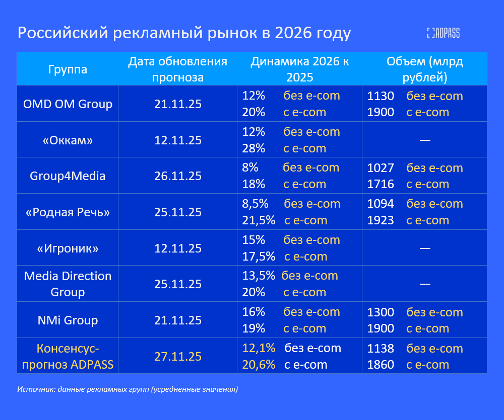 По консенсус-прогнозу, который ADPASS рассчитал на основе усредненных данных семи рекламных групп из первой десятки, в следующем году российская реклама покажет рост на 12,1% без учета ритейл-медиа, достигнув объема 1,1 трлн рублей. С учетом e-com рост будет выше — 20,6% при объеме 1,9 трлн рублей. Рост рынка в 2025 году российские группы оценили в 12% без e-com и в 20% с учетом сегмента онлайн-ритейла.